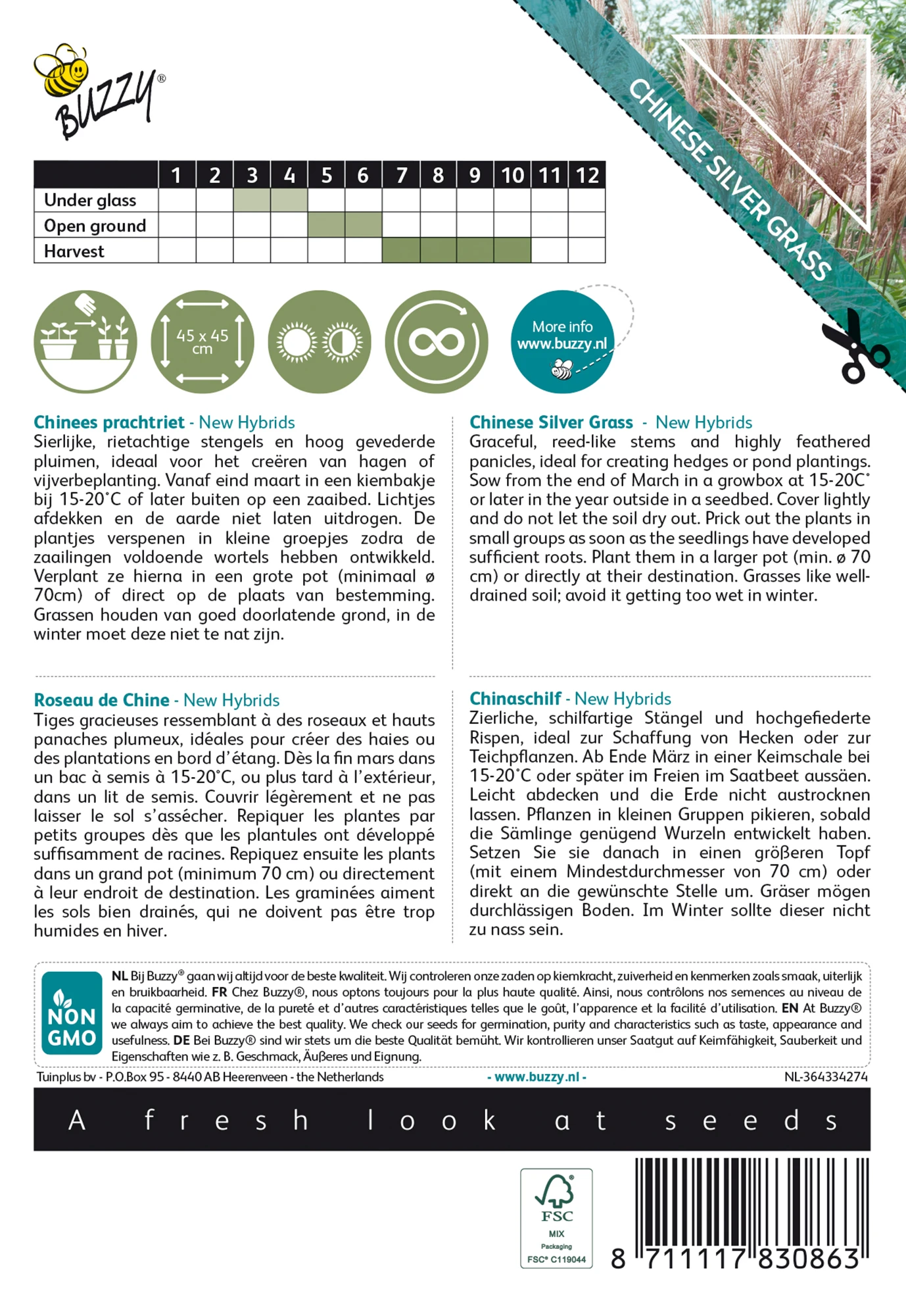 Zierliche, schilfartige Stängel und hochgefiederte Rispen, ideal zur Schaffung von Hecken oder zur Teichpflanzen. Ab Ende März in einer Keimschale bei 15 – 20°C oder später im Freien im Saatbeet aussäen. Leicht abdecken und die Erde nicht austrocknen lassen. Pflanzen in kleinen Gruppen pikieren, sobald die Sämlinge genügend Wurzeln entwickelt haben. Setzen Sie sie danach in einen größeren Topf um oder direkt an den Bestimmungsort. Gräser mögen durchlässigen Boden. Im Winter sollte dieser nicht zu nass sein.