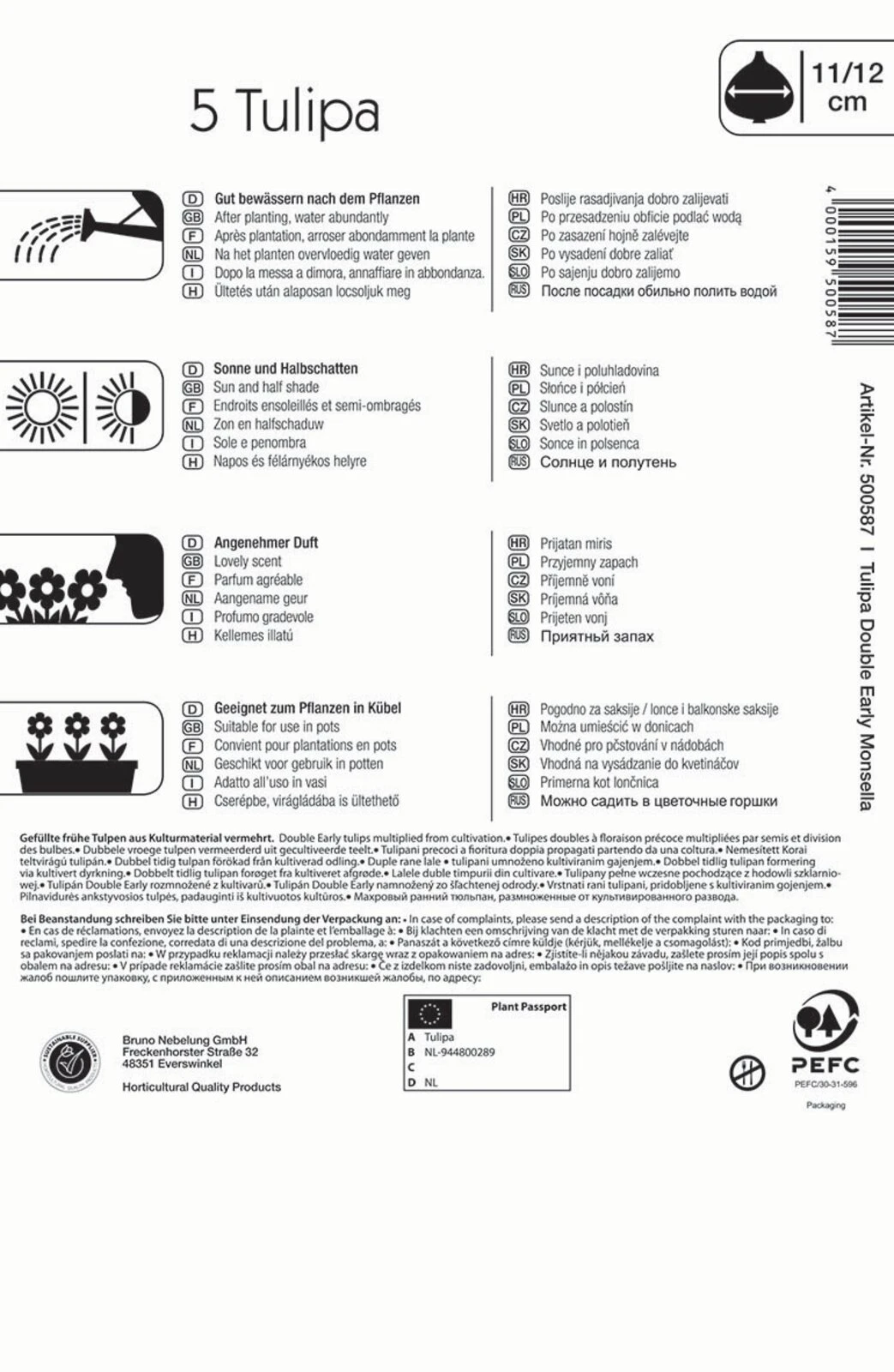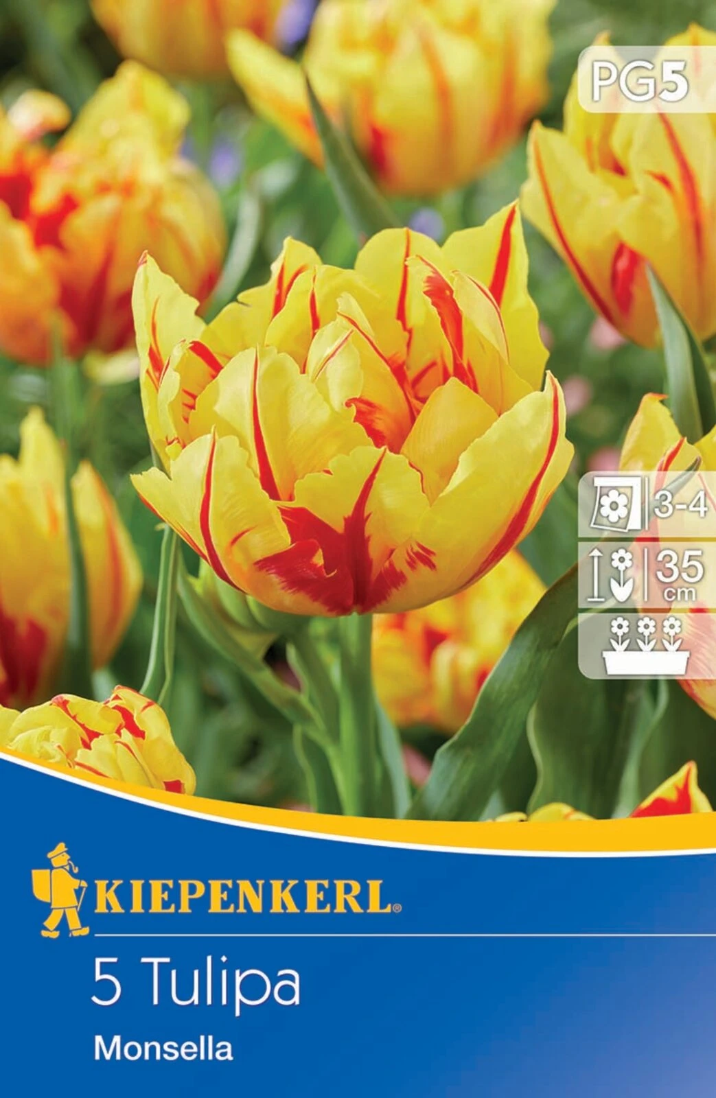 Die Gefüllte frühe Tulpe ‚Monsella‘ entfacht ein wahres Feuerwerk an gelb und rot geflammten Blüten. Diese Färbung der Blütenblätter ist wirklich spektakulär. Dabei sehen die Blüten nicht nur äußerst schick aus, sondern duften auch. Mit ihrer Höhe von 35 cm eignet sie sich neben einer Pflanzung im Beet auch für Kübel.