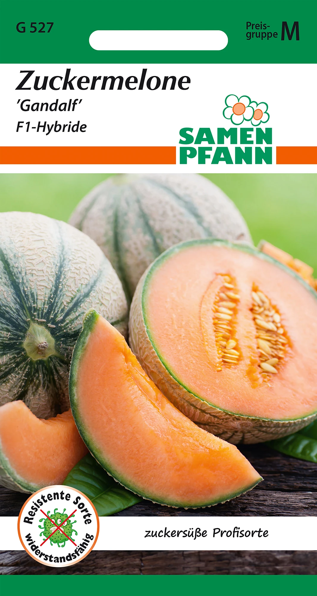 Sehr frühe Charentais – Melone mit genetzter Schale. Oranges Fruchtfleisch mit hervorragendem Geschmack und hohem Zuckergehalt. Hohe Resistenz gegen Fusarium – Welke.